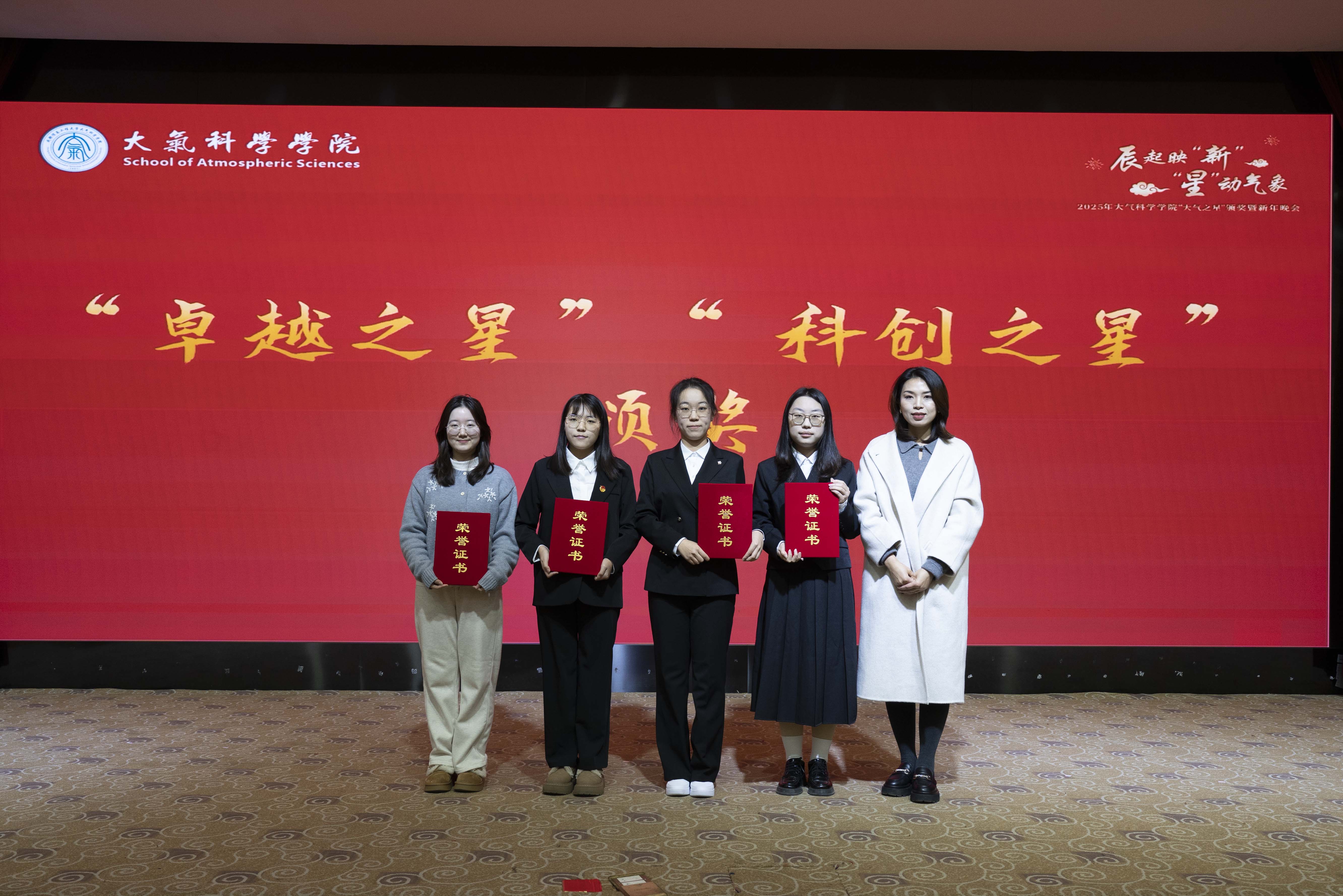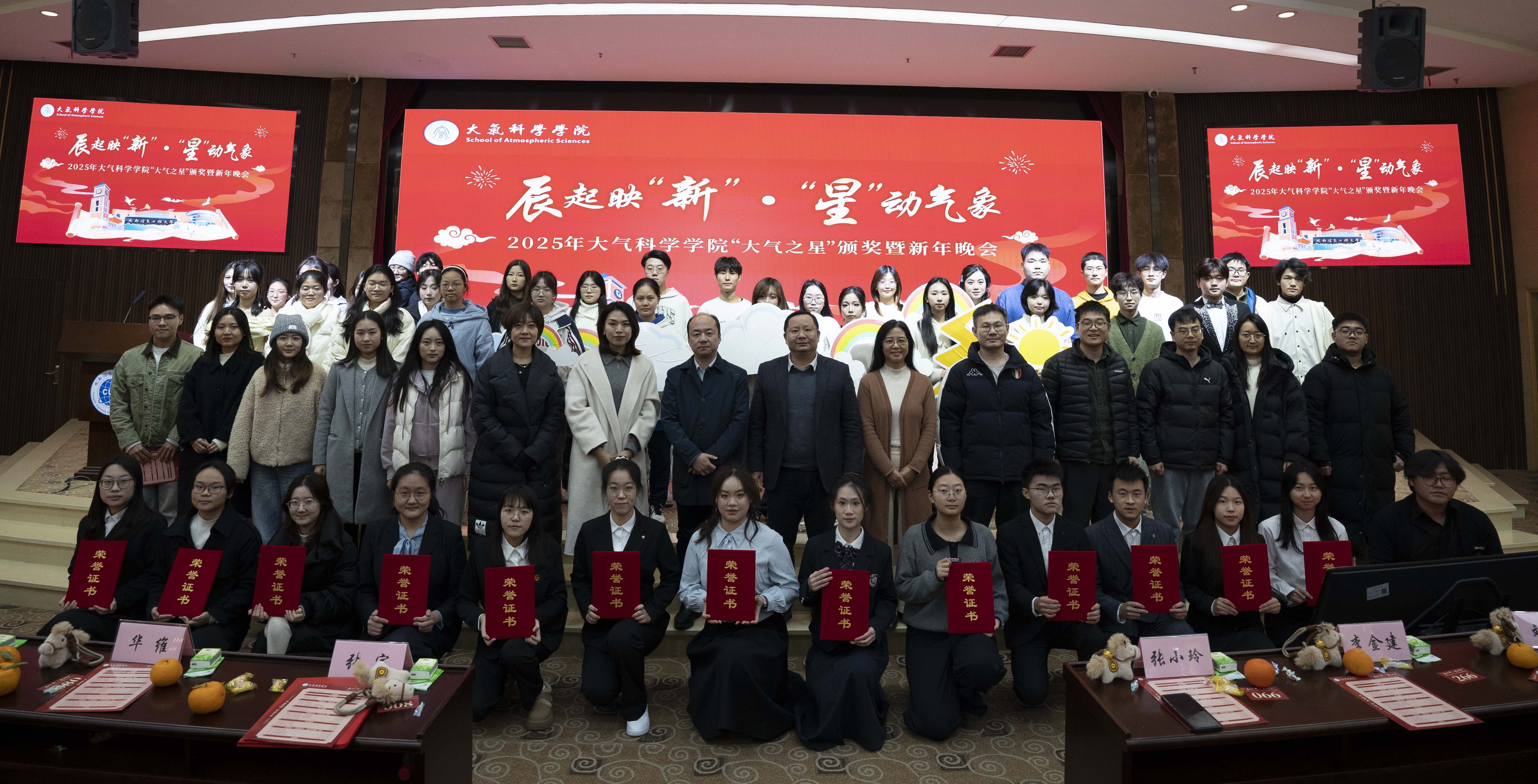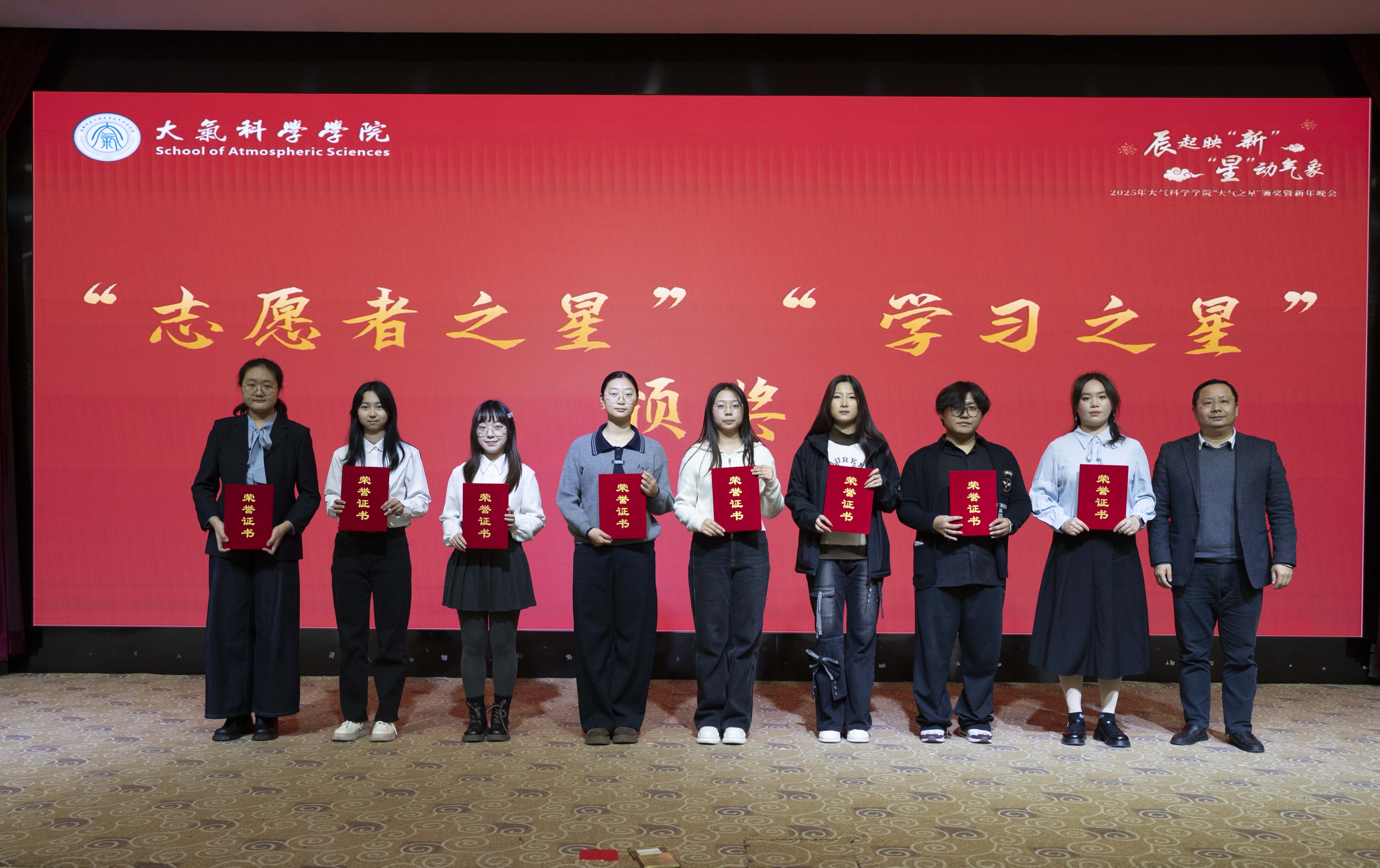 “辰起映‘新’·‘星’动气象”——2025年“大气之星”颁奖典礼暨新年晚会在此隆重举行。学院党委书记张宇、院长华维,学校党委学生工作部副部长陈敏,校团委及各兄弟学院教师代表,学院全体辅导员、2025级班主任,与近500名学生代表共同参加了此次活动。