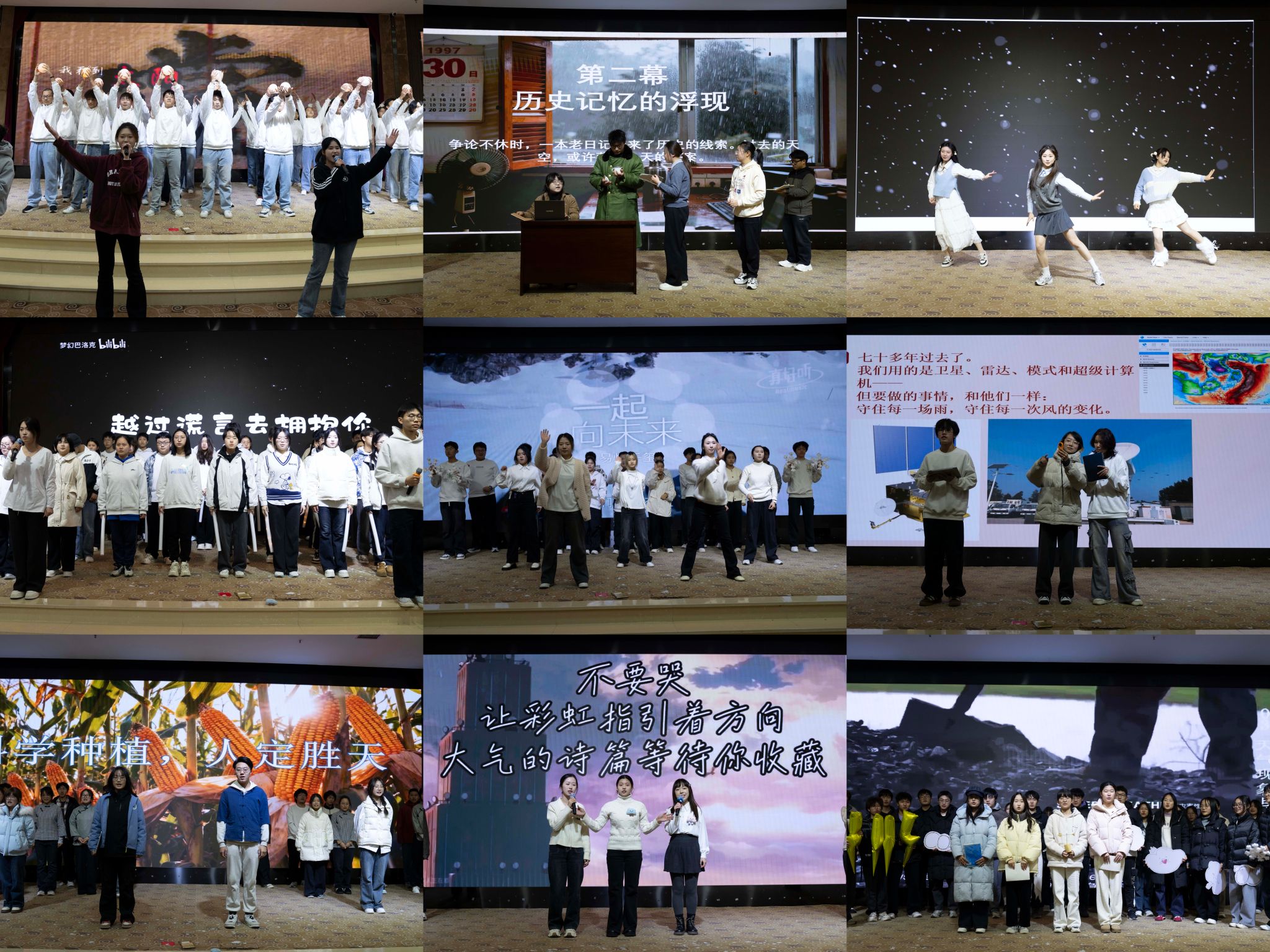颁奖典礼与2025级各班精心编排的文艺节目穿插进行,相得益彰。节目融合专业认知与青春创意,精彩纷呈:大气252班的舞剧《有我》舞出青年担当;大气255班的《风雨湘江·紫荆长虹》演绎家国情怀;大气251班的《雪落海底·初学赴光舞》诗意解读传统文化;应气252班的《宇海生风,气象观澜》展现人类观天智慧;大气253班的《冰韵青春,共赴新程》道出成长蜕变;大气254班的《大气为笺,长歌未央》致敬气象追梦人;应气251班的《金穗顺天时》生动呈现气象知识服务农业生产的现实价值;大气英才班的原创剧《大气香》探讨理想与选择;大气256班的《熠星和声》用清澈歌声传递力量。